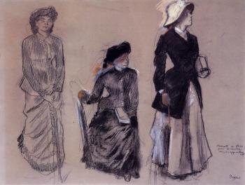 Reviewing some old files, I found these sketches by Edgar Degas, which I had labeled "Effie studies." It made me smile. Ordinarily, I like to highlight female artists in this blog, but who can resist the occasional work by the other sex? In this case, I remember thinking that it was as if I were seeing dimensions of my own character revealed to me by an artist who had seen her in a slightly different way. The seated woman in the middle one is, self-effacing, but not unintelligent. The one on the right—unself-consciously clutching her bag or a book and her umbrella—catches aspects of the Cousin Effie who made her way around Paris on her own while Jeanette was in class in Where the Light Falls. And, of course, they really pertain to Degas' depiction of Mary Cassatt in the Louvre (ca. 1880).