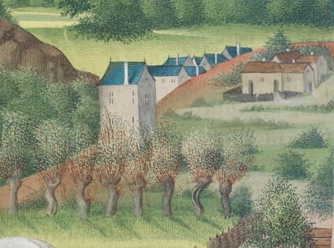 In trying to impose order on my messy computer folders this morning, I came across this image I had saved months ago from a manuscript digitzed at the excellent Virtual Manuscript Library of Switzerland. Artist Jean Colombe provided eight full-page illustrations for a manuscript (ca. 1470) of Le Mortifiement de Vaine Plaisance (1455) by King René of Anjou. To be honest, I have not tried to read the manuscript nor find out just what the allegorical meaning of this particular picture is. What I strikes me in this detail are the pollarded trees and the wattle fences, the different roofs (slate and tile), the slope of the hill between parts of a village, and the hint of a setting for a story. Kathleen Jennings recommends loving your tools as a way to jumpstart creativity. Manuscript illuminations are one of mine. What are yours?