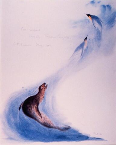So far, in my Book and Illustration series, I have talked about illustrated fiction. For that matter, most of my blog is about how various kinds of images stimulate visualizations for creative writing. But art plays a big role in the page design and impact of non-fiction, too. Right now, I'm reading The Continent of Antarctica by Julian Dowdeswell and Michael Hambrey, which is heavily illustrated with page after page of stunning photographs. Yet here and there, Edward Adrian Wilson's watercolors are reproduced also. Besides being of historic interest, they add a different texture and subjective beauty to layouts. In this picture of a leopard seal chasing penguins (which appears between two photographs on p. 176), the sweep of the artist's lines introduce a sense of motion and felt immediacy.