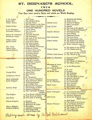 Ninety percent of the authors' names are at least recognizable today, but wouldn't a list of "One Hundred Novels That Boys have cared to Read" look different today?!? (Harry Potter, anyone?) And what about girls, then and now? To be fair, St. Bernard's was, and is, a boys-only school, so the list fitted its population. Still, I'd love to see a list of what their sisters cared to read in 1914. Little Women would probably be at the top, and not just alphabetically for Alcott!