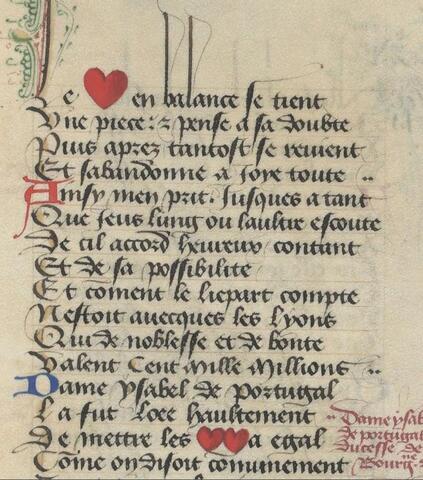 Okay, so I missed Valentine's Day for this post, but how about two hearts on Sadie Hawkins Day? For some reason, I'm always tickled see the heart shape as a symbol of love in 15th C manuscript illuminations. Here it's right in the text—and not just once, but twice. The line says that two hearts are put into accord, "made as one," made equal (mettre a egal). Bon!