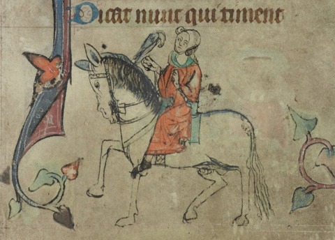 Not much point to posting this image from the bottom of a medieval Book of Hours, except that it's interesting to see a 14thC woman depicted riding astride. I'll add that I like the quizzical look on her face, the big-headed horse who seems to have thoughts of his own, and the preening merlin (the hunting hawk appropriate for a lady). Make of it what you will!