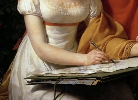 A friend recently bought an early-19th C miniature portrait that shows a woman writing a letter. It struck me that her pen-holding hand rested only on her little finger, something my fifth-grade teacher insisted on. (Ever since, I have enjoyed defying that teacher by resting the whole side of my hand against the surface.) For fun I looked for other images of Regency ladies writing and found this one, which shows something closer to the way I hold a pencil on paper. Not sure how my childhood experience or a detail in a painting could be used in fiction, but odd things make connections hop out in the imagination.