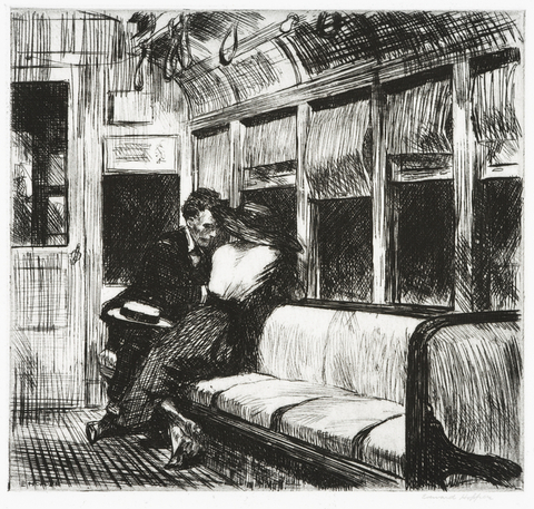This summer, my husband and I went to an exhibition, The Unknown Hopper: Edward Hopper as Illustrator on view at the Norman Rockwell Museum in Stockbridge, Massachusetts, through October 26, 2014. Night on the El Train was not among the work we saw. It is, in fact, one of the freestanding etchings that Edward Hopper made in an effort to support himself beyond magazine illustrationat the start of his career. The Rockwell show, however, demonstrates how much drama and focus he brought to his commercial drawings.