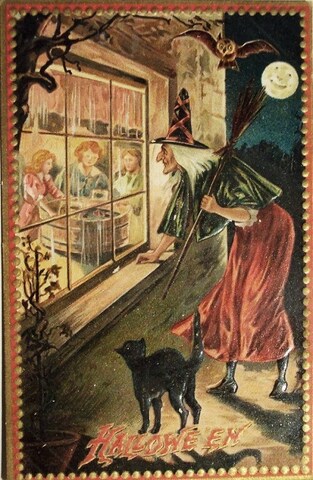 From today’s post at It’s About Time on Halloween cards, this image of a stereotypical witch looking wistfully through a window at an innocent childs' party is the only one that says to me “This could make a story.” Yet I can imagine a writers’ group dealing out the cards to come up with plots as an exercise. In fact, my writers in ANONYMITY would be familiar with these very cards—and now I have a new avenue of research. Which illustrators at the turn of the 20th C produced such cards?!? If anyone knows, please comment.