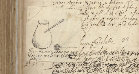 This year, my sister gave my husband and me matching Spode Christmas mugs in a bulbous shape with candy cane handles. Imagine my delight today when I stumbled across this 17th C image of a chocolate “pottel.” Hot chocolate tonight!