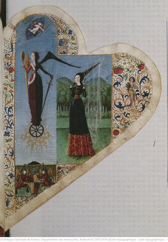 This image from the heart-shaped songbook, Chansonnier cordiforme de Montchenu in the Bibliothèque nationale, in Paris delighted me when I came across it. Story, story, story! There must be a story to go with the illustration, but just as much fun to make one up. Perhaps a love story with Cupid, an ultra-sophisticated Fortuna, and a wasp-waisted maid? a mystery about a stolen medieval artifact? a fantasy about a book with magic powers indicated by its shape?