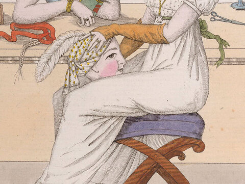 A lithograph by Claude Regnier shows a midcentury modiste adding a ribbon rosette to a bonnet on a marotte. An interesting etching by Norbert Goeneutte from before 1888 shows a milliner, a hat on a stand, and a marotte.