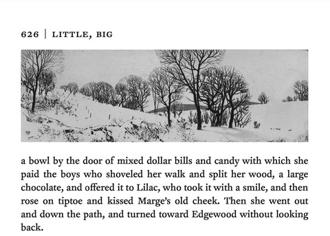 My copy of Little, Big (to which I subscribed in 2008!) arrived last week; and, oh, yes, it was worth the wait. The interplay of John Crowley's text and Peter Milton's art is just what they hoped: the illustrations are independent of the text and yet they illuminate. In fact, earlier this week, I woke up and saw out my window a Peter Milton landscape. My bedroom window looks up a field to a row of white pine trees. In the gray light of early morning, light snow had fallen and the scene might as well have been one of his etchings. When a book makes you see through its eyes, well, what could be better?