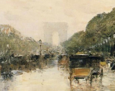 This loosely painted detail of the distant Arc de Triomphe in the background of Hassam’s