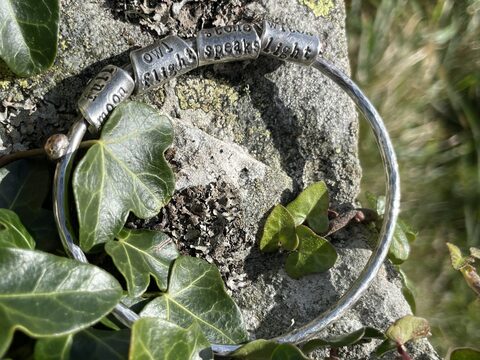 Blog post alert: In A question, Jackie Morris recounts being caught by surprise when asked, "What brings you joy?" All of her answers are worth reading (do click on the link), but I've selected one to imitate. She and a friend collaborated on the bracelet shown here. It embodies her chant/charm/poem: "full moon, owl flight, stone speaks, witch light."