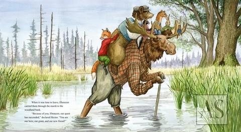 I've just been introduced by our Western Massachusetts public library system to Astrid Sheckels and her Hector Fox books. I can't tell you how delighted I was to come across Ebenezer Moose, shown here, in Hector Fox and the Giant Quest! For many years, my husband and I vacationed at a lake in Maine, where we almost always saw at least one moose and especially loved spotting them in remote marshes. Sheckels' evocation of that landscape is evocative.