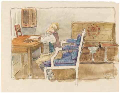 She also illustrated other writer's books, such as The Wonderful Adventure of Nils Holgersson by Selma Lagerlöf, for which this watercolor is a preliminary design. I haven't read the Lagerlöf book (which is available in a new translation), but this picture of a daydreaming boy and a tiny figure climbing out of the chest could suggest a story just by itself, don't you think? Or prompt a poem about the nature of imagination?