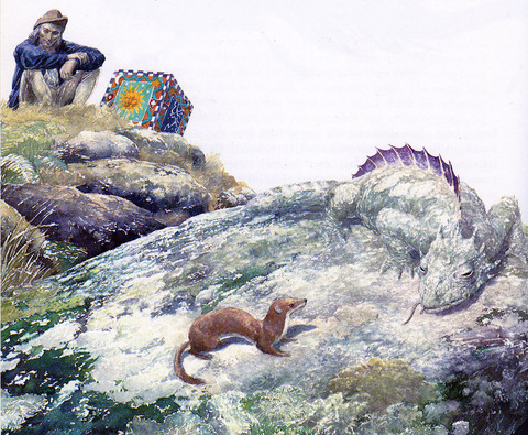 Hoo boy! How's this for a follow-up to yesterday's post? A transformation of every major element of Hollar's Pedlar into something lively, colorful, and strange. Lion-dog: otter. Skeleton: dragon. Peddler: traveller. Pannier: mystery box. It's Alan Lee's illustration for a story in Merlin Dreams by Peter Dickinson. I have just requested the book through interlibrary loan to find out what's going on. (As an author, I encourage people to buy books. As a library trustee and environmentalist, I urge you to remember what marvellous resources the country's public libraries provide.) As for this picture, I guess I'll wait to see what Dickinson was up to, but wouldn't it be fun to make up a story of one's own to go with it?
