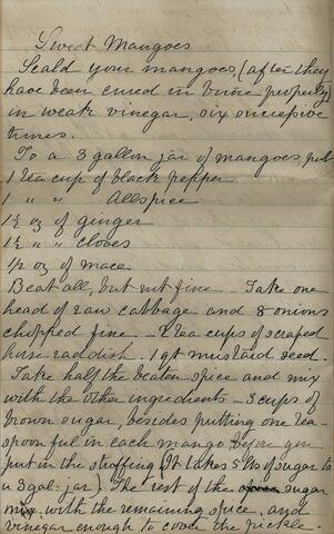In a family letter dated November 29th, 1887, I found this recipe for "Sweet Mangoes." What fun, thought I, mangoes! Who knew they would be familiar in 19th C Farmville, Virginia? The more I read, however, the more puzzling it became. Three gallons of mangoes? And cabbage? At this point I did the obvious: I Googled. It didn't take long to learn that a mango is "a green pepper stuffed with cabbage and mixed, minced picket, highly spiced and whole pickled together." Now if someone can just tell me what a picket is …