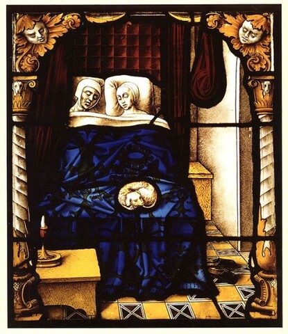 My husband drew my attention to an article, How our ancestors used to sleep, which included an image of this window. I already knew that people went to bed at sundown and generally slept in two nightly stages (I've come across the phrases "first sleep" and "second sleep" as early as Chaucer and as late as Emily Brontë). What interested me here were a dog sleeping on the beds with its people and stained glass.