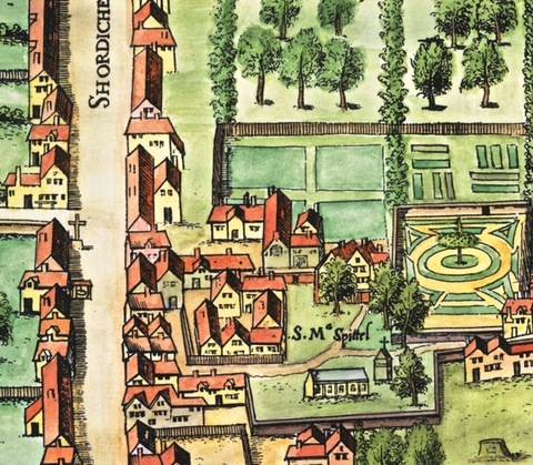 This detail from a bird's-eye map of Tudor London is taken from a blog post, In the Charnel House, about, what else? excavation of a 14th C charnel house. The post has lots of information about history, the stonework being uncovered, etc. What made me save the image, however, was its depiction of the cluster of buildings and gardens adjacent. It comes from the Agas map, for which there is a dedicated website. The site takes a bit of getting used to, but it's an invaluable resource.