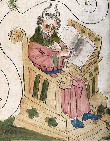 It's the glasses. Dark glasses, no less! The medieval iconography of Moses with horns is goofy enough, but these spectacles are irresistible. The question is, What to do with the picture besides use it to expound an oddity in art history? Maybe let it provide a model for some imaginary wizard? I like the idea of substituting a goat's face for the man's.