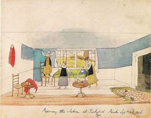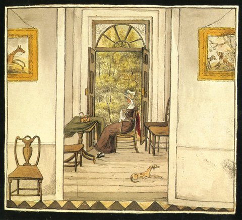 As a follow-up to our writer in the library, Mrs. Sperling at her. needlework is another glimpse of Regency life. It prompts fewer ideas for stories, but isn't it cheerful? I love the way you look through the open French doors into trees, for instance. And it leads to Mrs. Hurst Dancing & Other Scenes from Regency Life, 1812–1823, with with all the freshness of amateur-artist Diana Sperling's authentic delight in the life around her.