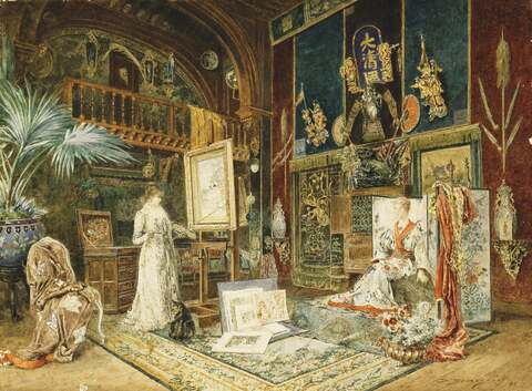 Three things I love: pictures of 19th C artists' studios, landscapes out over rooftops, and glimpses of worlds through windows. All three are present in Dagnan-Bouveret's painting. Look at the Japanese parasol on the far wall, the Oriental rug used as a table cover, the blue-and-white jug—to hold paintbrushes, no less. Or out the window at golden light over Paris. I haven't been able to track down where the original hangs; but as a stimulus to imagination, it doesn't matter.