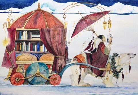 Blog tip: Just look! Another of Jackie Morris's Christmas fantasia designs, this one in supprt of the International Board for Books for Young People. Ladies who love to read, sigh with pleasure (and click on the image for an enlargement at her website).