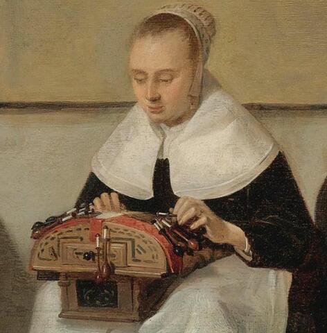 Serendipity: Cold weather sent me searching for images of hot-water "pigs," ceramic bottles used as foot warmers (my old dissertation director once told me about how the monks in an Irish monastery provided her with one when she was doing research in their unheated library). A thumbnail at Foot warmers: hot coals, hot water sent me next on a hunt for an enlargement of a Dutch painting that shows a family using boxes of hot coals to warm their feet. No luck. What I found instead is a different painting by the same artist, Quirijn van Brekenlenham of a family in an interior. No foot warmers, but wow! what an exquisite depiction of lace-making. In this time of pandemic and Zoom, a reminder that we should all find time to work with our hands.