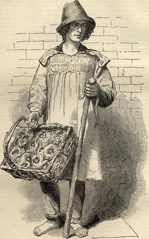 Blog post alert: Henry Mayhew's Street Traders reproduces a few of the engravings in London Labour and the London Poor of men and women who made a living on the streets in the Victorian era and quotes the text that accompanies each. The passage that accompanies this picture, for instance, begins, "I am a seller of birds'-nesties, snakes, slow-worms, adders, "effets"–lizards is their common name–hedgehogs (for killing black beetles), frogs (for the French – they eats 'em), and snails (for birds) – that's all I sell in the Summertime."